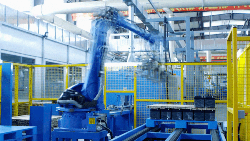 一台台工业机器人,灵活地摆动机械臂来回取货,工人们操作着电脑,热火朝天地组织生产。